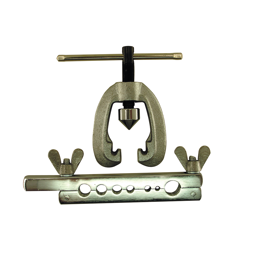 HEAVY DUTY FLARING TOOL -FLARES COPPER AND ALUMINUM TUBING IN SEVEN OD SIZES OF 3/16″, 1/4″, 5/16″ 7/16″, 3/8″, 1/2″ AND 5/8″. QUICK OPENING MALLEABLE HINGE. SWIVEL FLARE HEAD.